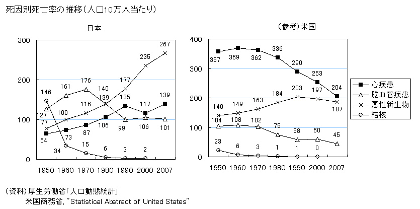 米国のがん死亡率が減ったって言うてますが、この図から見ると3大死因、心疾患、脳血管疾患、悪性新生物とも米国は減少していますよね。